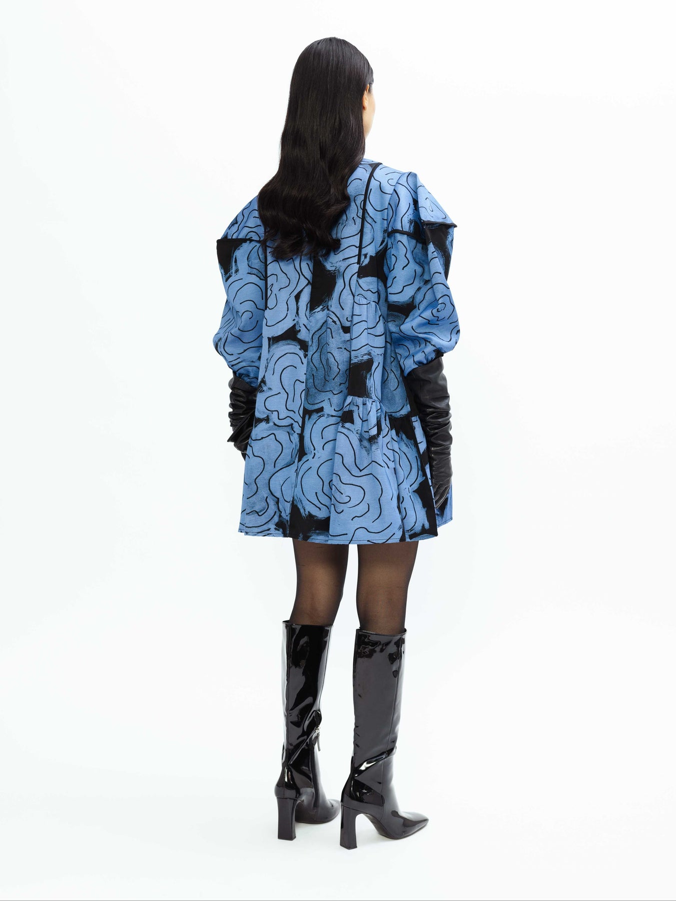 A mini dress featuring a modern rose print, puffed sleeves, thin black buckle belt and pleated detailing. Perfect for a chic, statement look that works for more formal occasions.