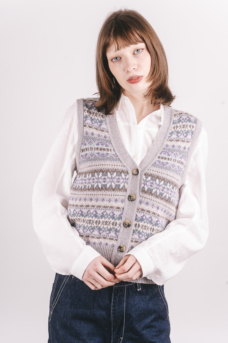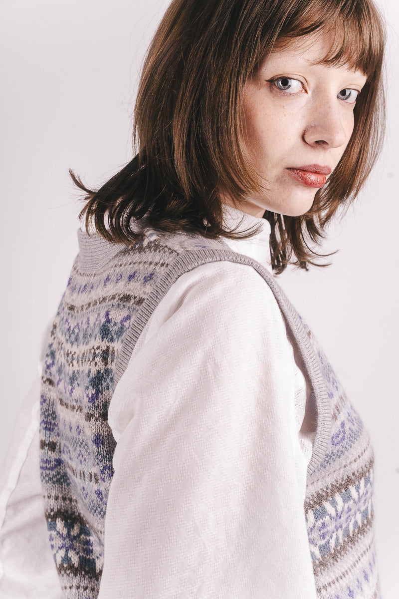A regular fit, V-neck waistcoat that gives a flattering effect due to the long rib hem that hugs the hips. It feels like soft cashmere and is thicker than the Corry and Alpine range. The Fairisle is on the front and back.