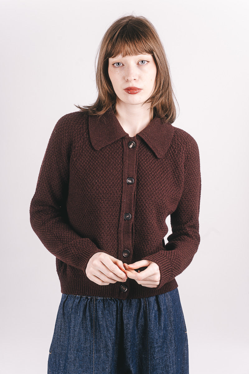 Designed by Frontiers founder, Jane Forbes, and knitted in Scotland, the Seed cardigan is a textured 100% lambswool cardigan with a knitted rib collar and down band, and a fully fashioned raglan sleeve.