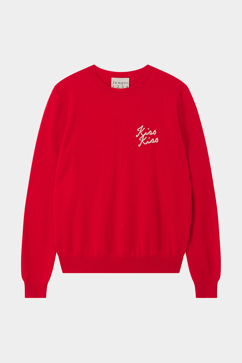 Jumper 1234 cashmere jumper. Cashmere crew neck jumper in red with white "Kiss Kiss" intarsia. Also available in navy, true to size but we recommend sizing up for more oversized effect. Looks great paired with dark wide leg trousers or white jeans.