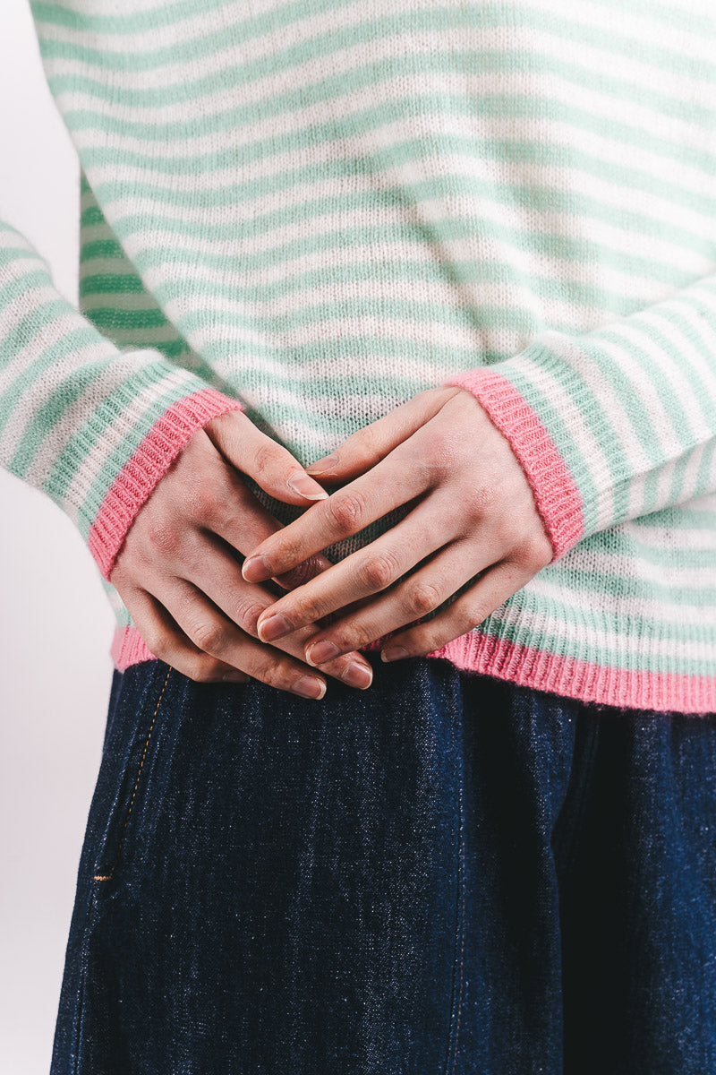 Tipped Little Stripe Cashmere Vee - Mojito/Cream/Cosmo Pink