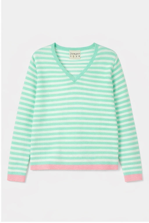 Jumper 1234 cashmere jumper. Lightweight vee neck stripe cashmere jumper in green and cream with contrast pink ribs at the cuffs and hem. It's a boxy fit, plus, comes in a couple of colours. This would be best worn with some wide leg white trousers.