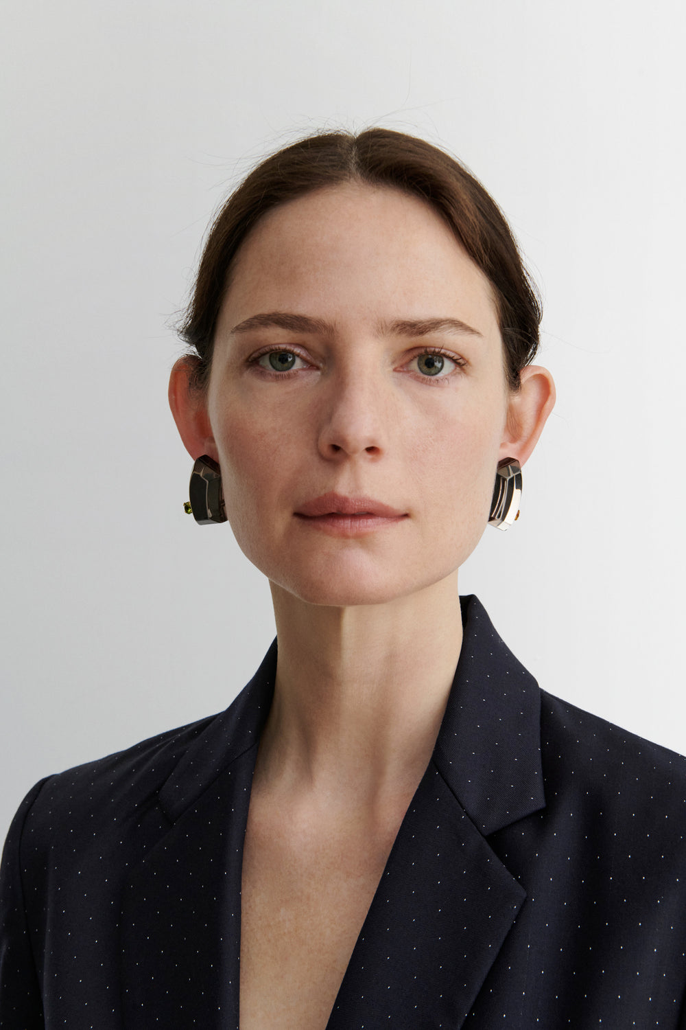 Sculptural and light-catching acrylic earrings featuring rhinestone details. Sold as a pair.