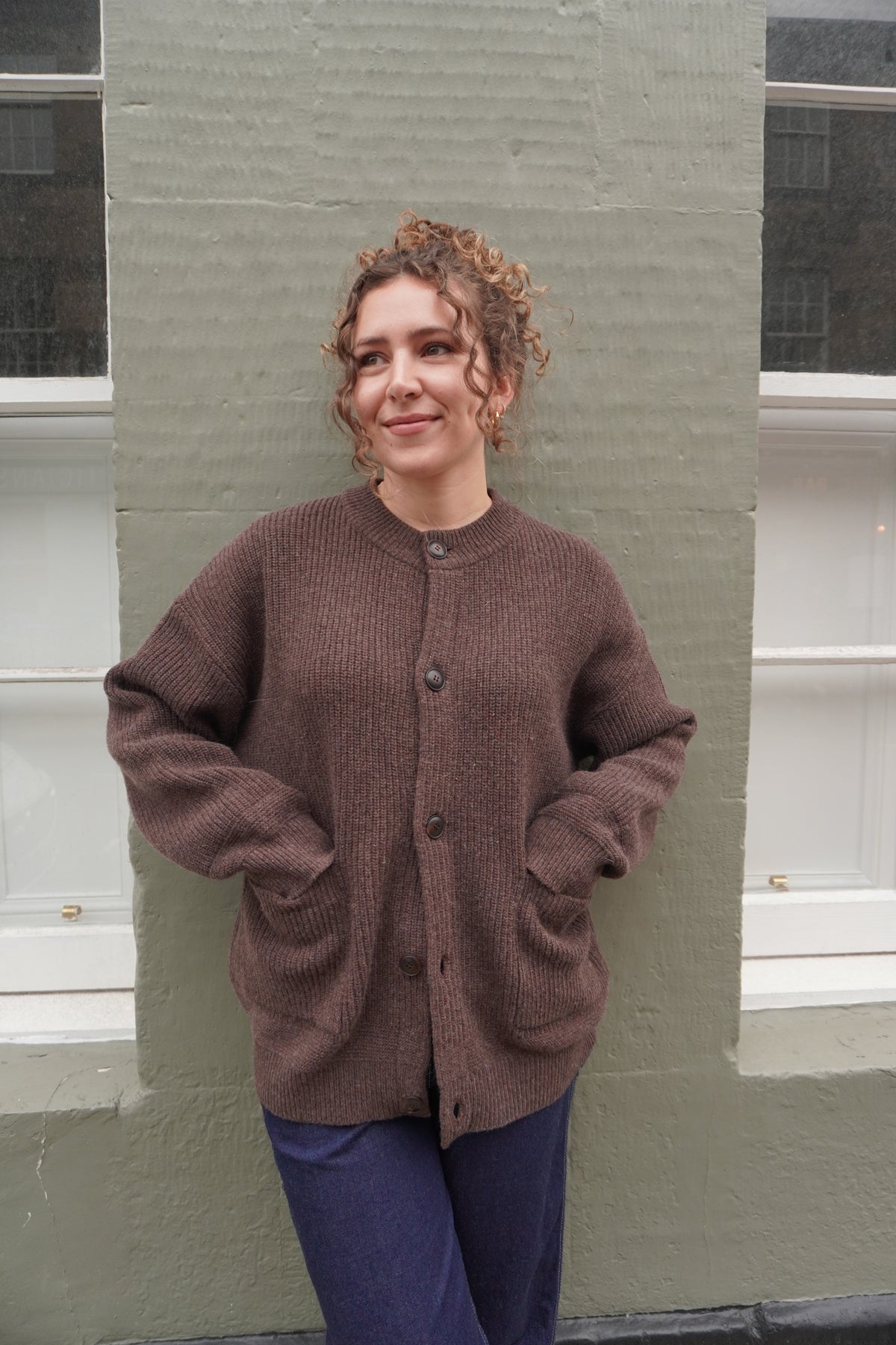 This Round Neck Cardigan takes inspiration from 1950s and 60s Korean workwear, reimagined in a heavy wool blend for today. Vertical ribbing through the body and natural ox horn buttons bring subtle detail to a piece designed for lasting wear and character.