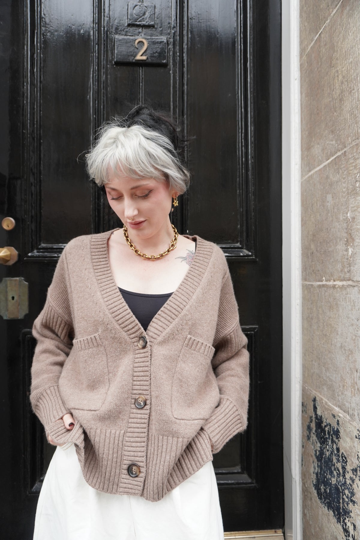 Jumper 1234 V-Neck Guernsey Cardigan with stitch detailing on front and sleeves in Fawn grey.
