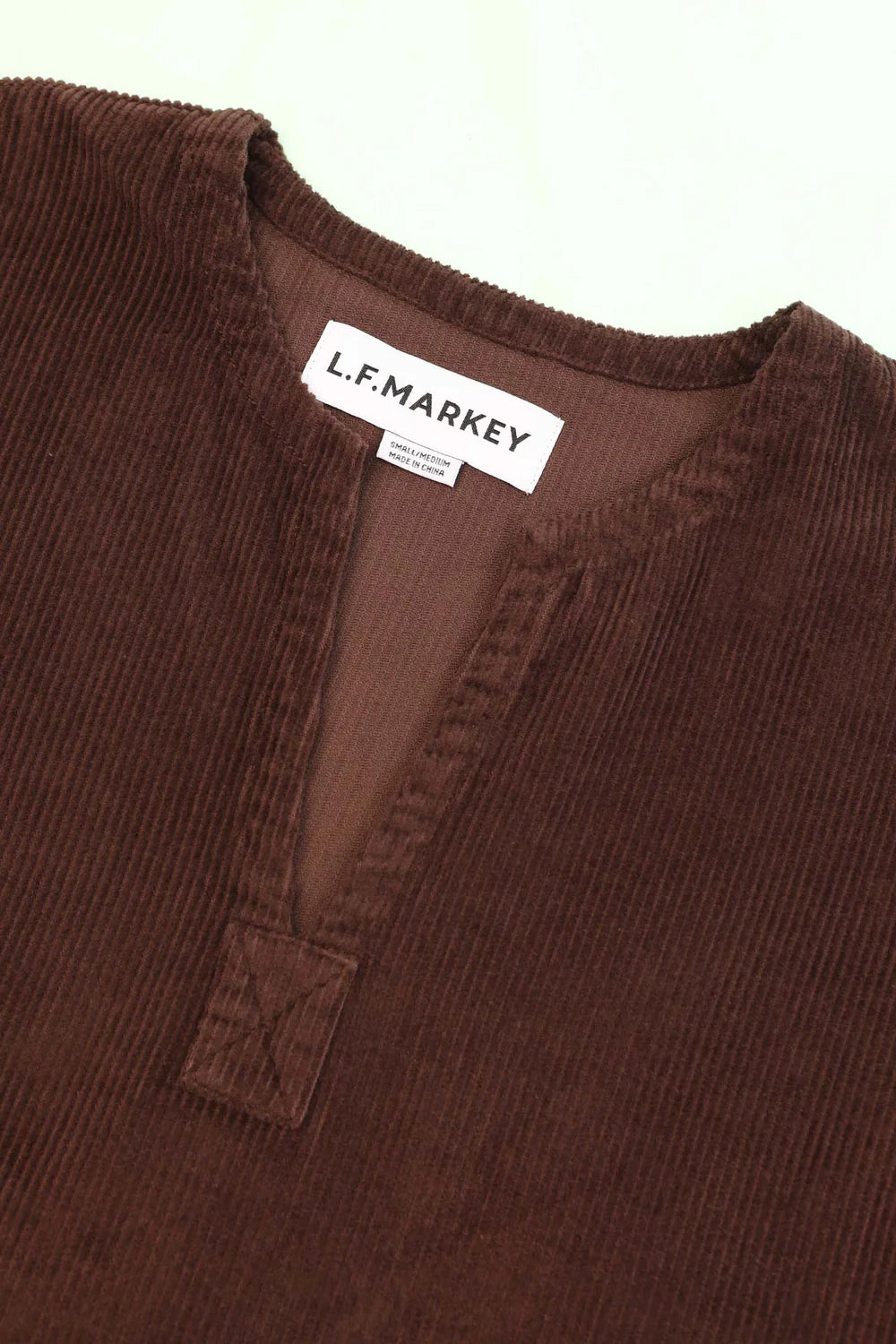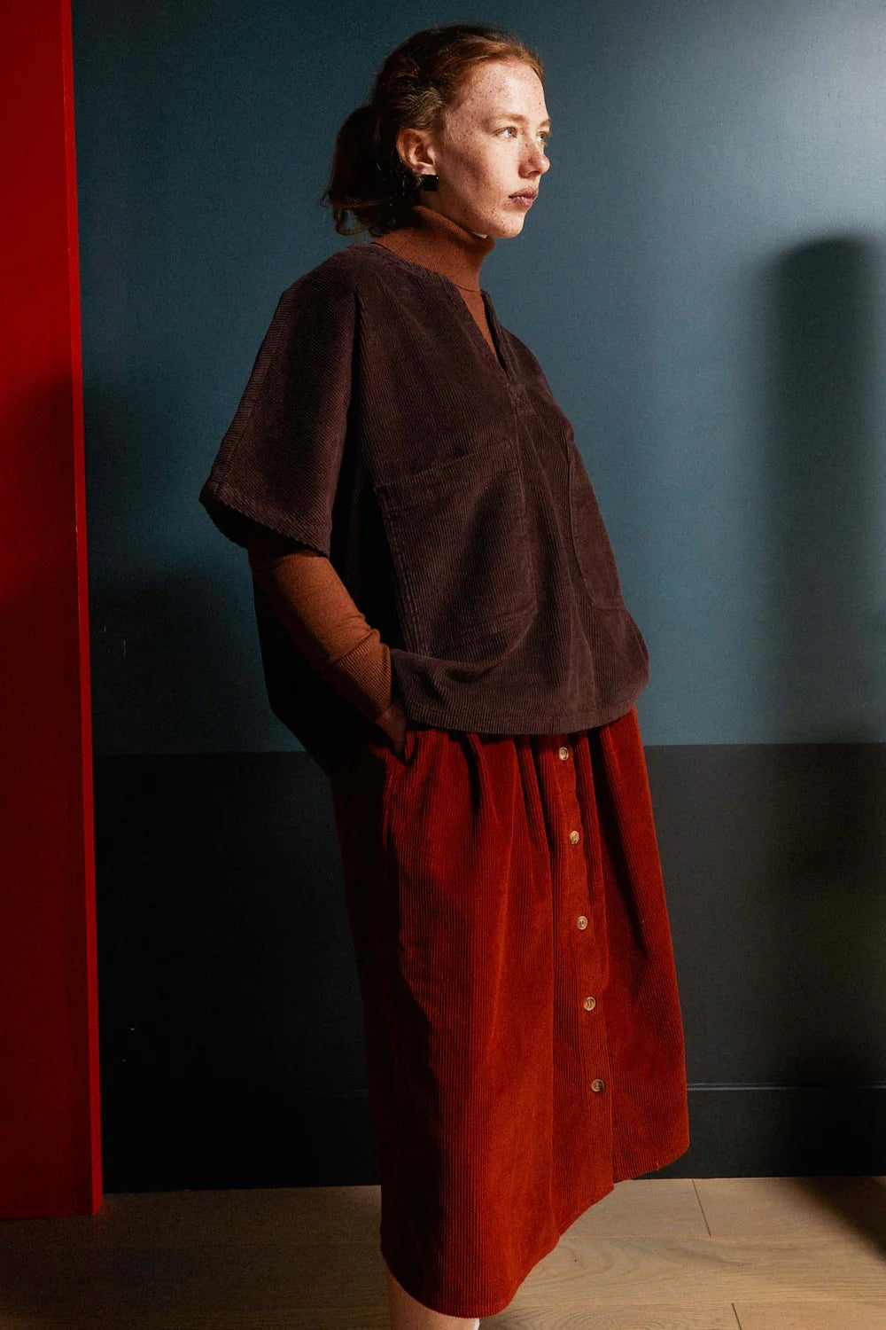 The Trevor Top is a wide-fit, boxy square shape top with a slight crop and short sleeves. Featuring a low v-neckline and front patch pockets. Made from a deep umber brown cotton corduroy.