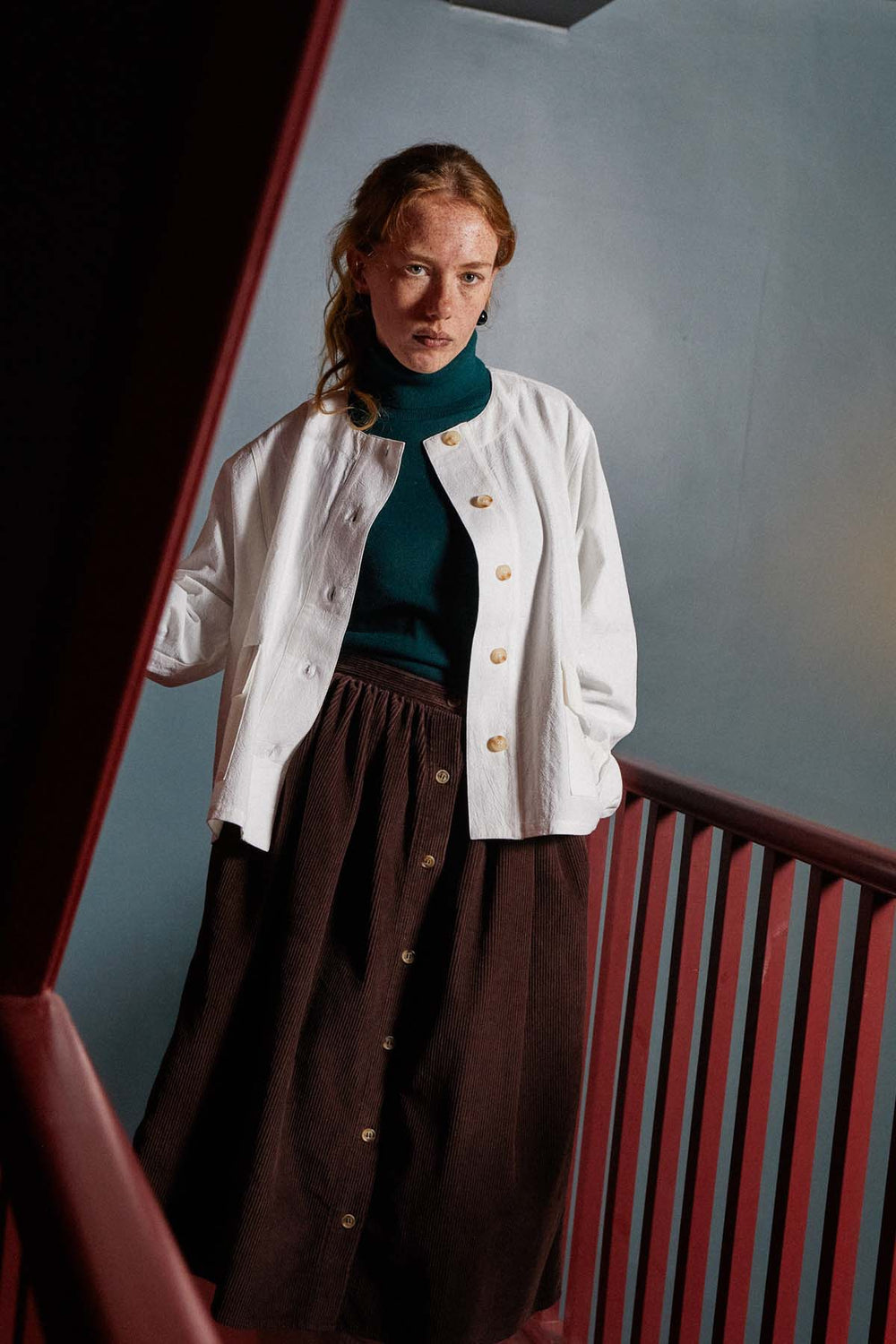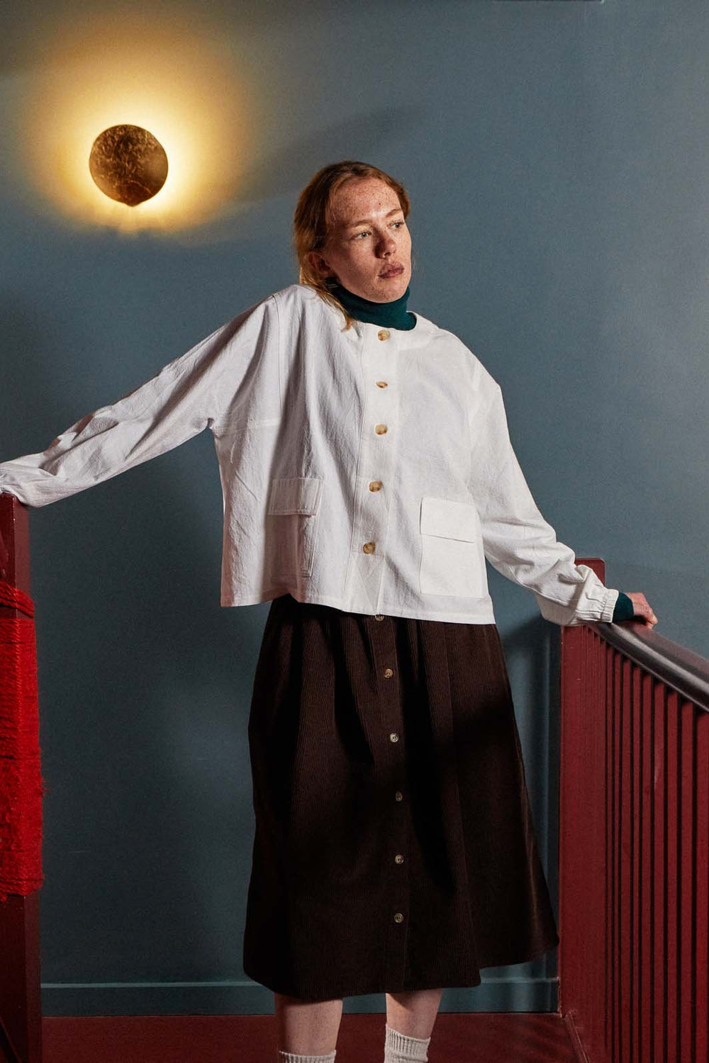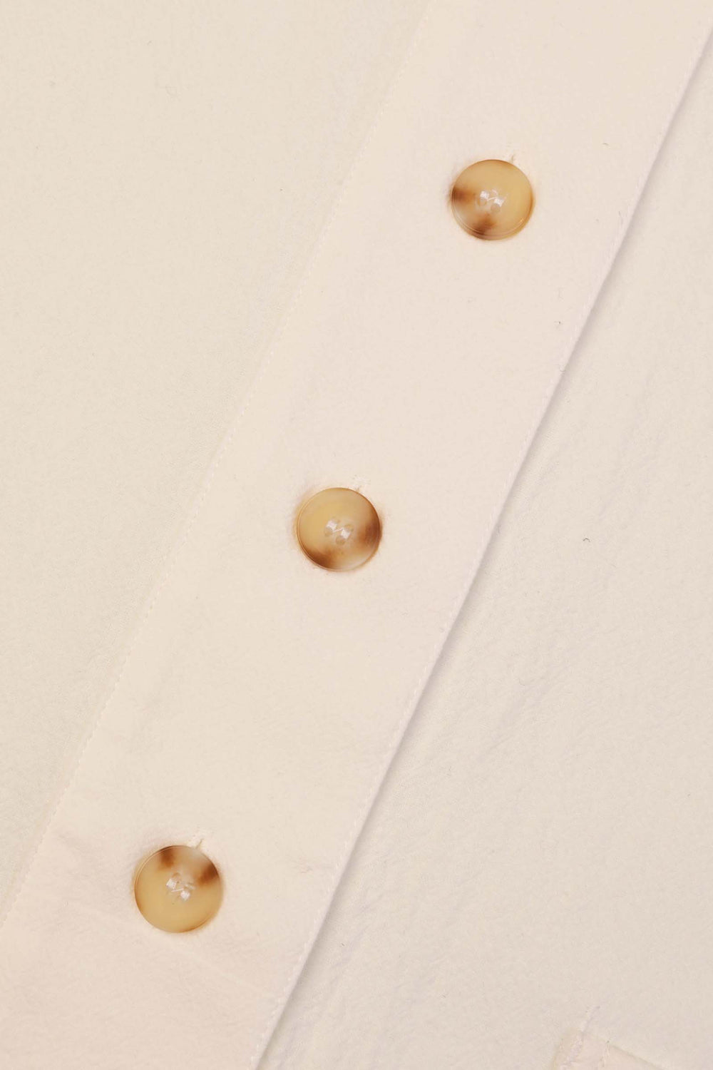 The Noel Top is an easy-wearing top made in a cotton crepe that brings a subtle texture. A collarless style with a boxy square silhouette, it features patch pockets and contrast horn buttons down the front placket.