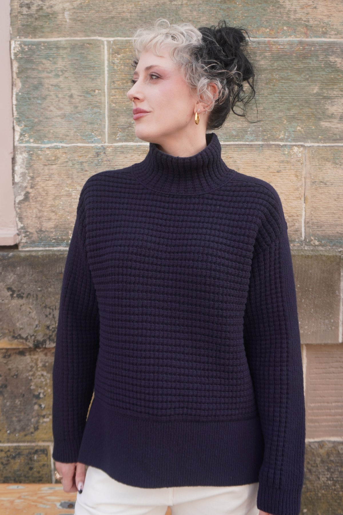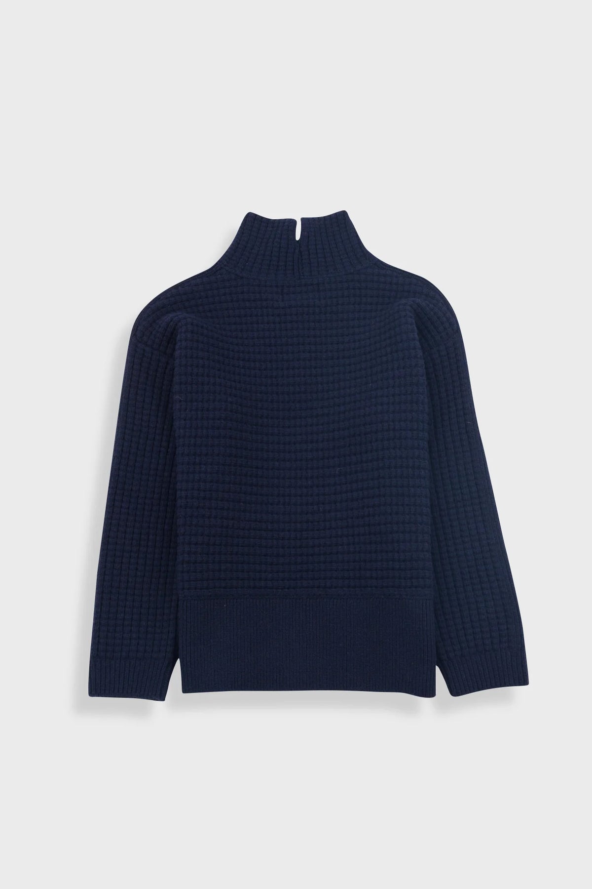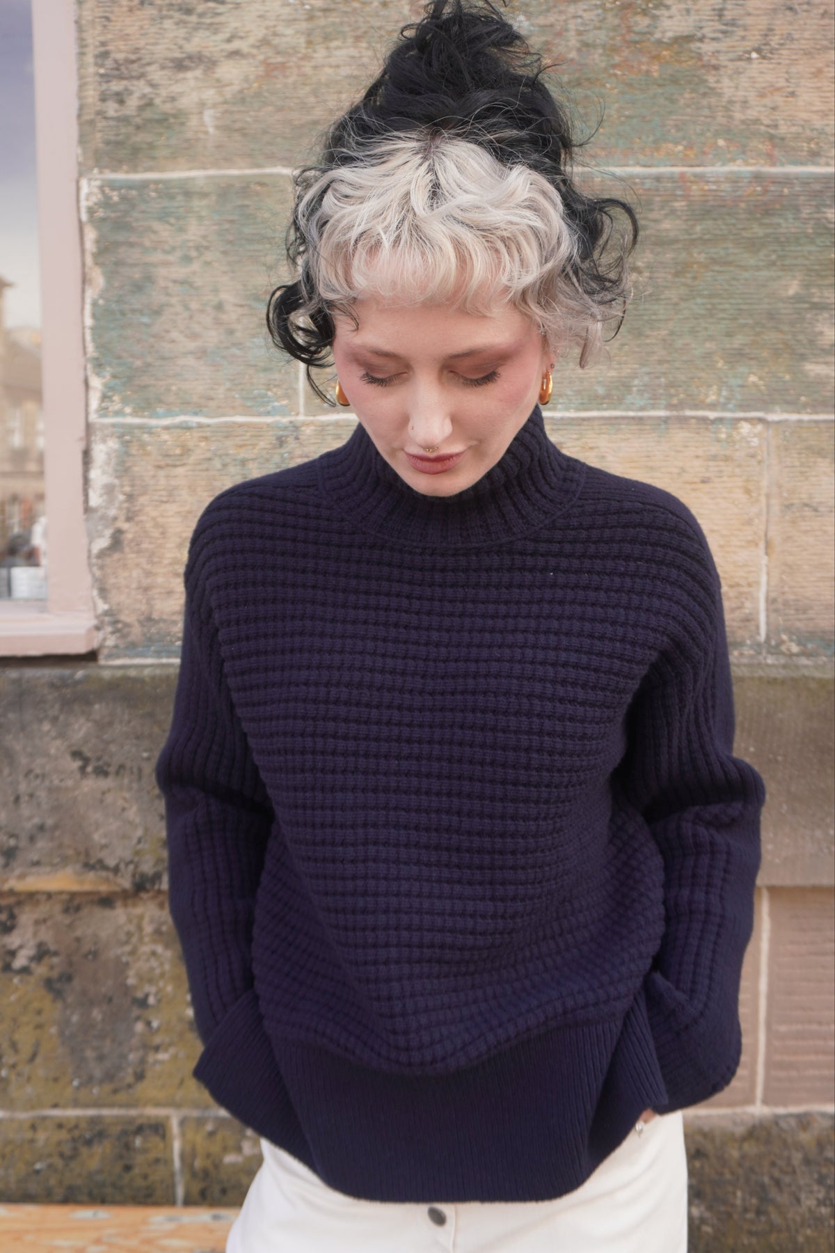 Super soft and versatile knitted wool blend jumper with high neck and wide cut.