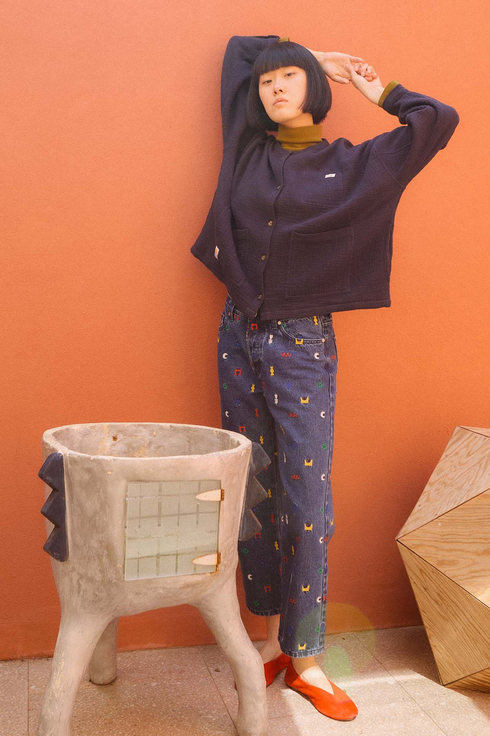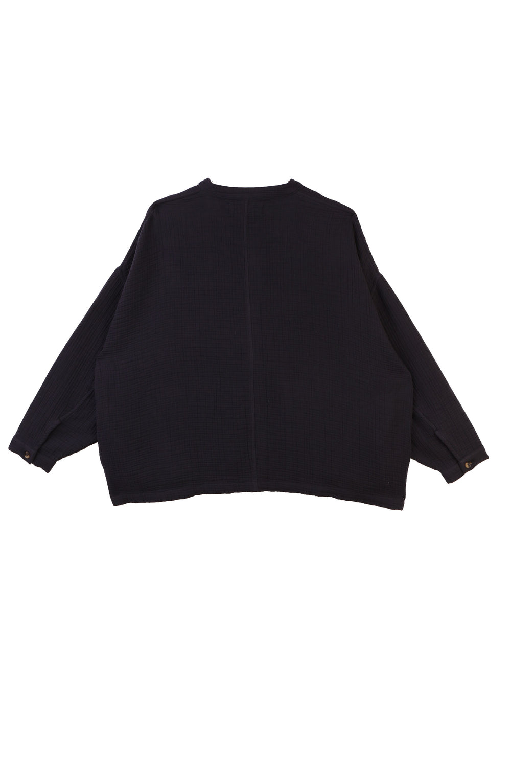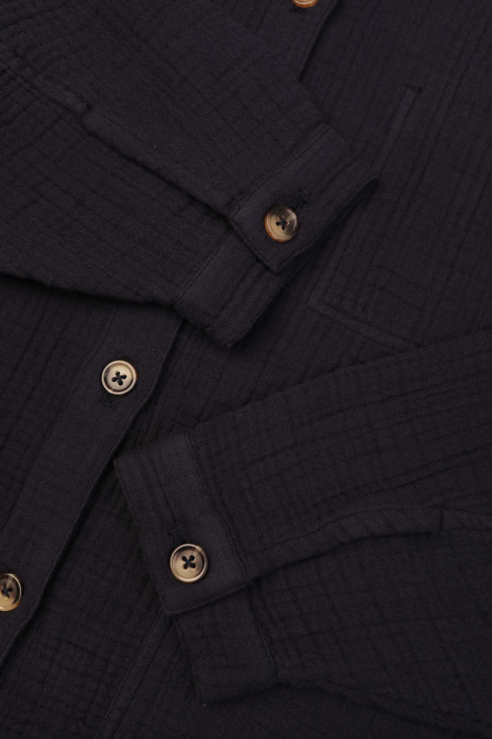 LF Markey's take on a classic chore coat with a wide boxy shape, voluminous sleeves and imitation horn buttons down the front. With side seam pockets and front patch pockets. Made in a textured 4-layer crinkle organic cotton gauze which adds tactility and dimension, with our signature sun and wave woven patch logos dotted throughout.