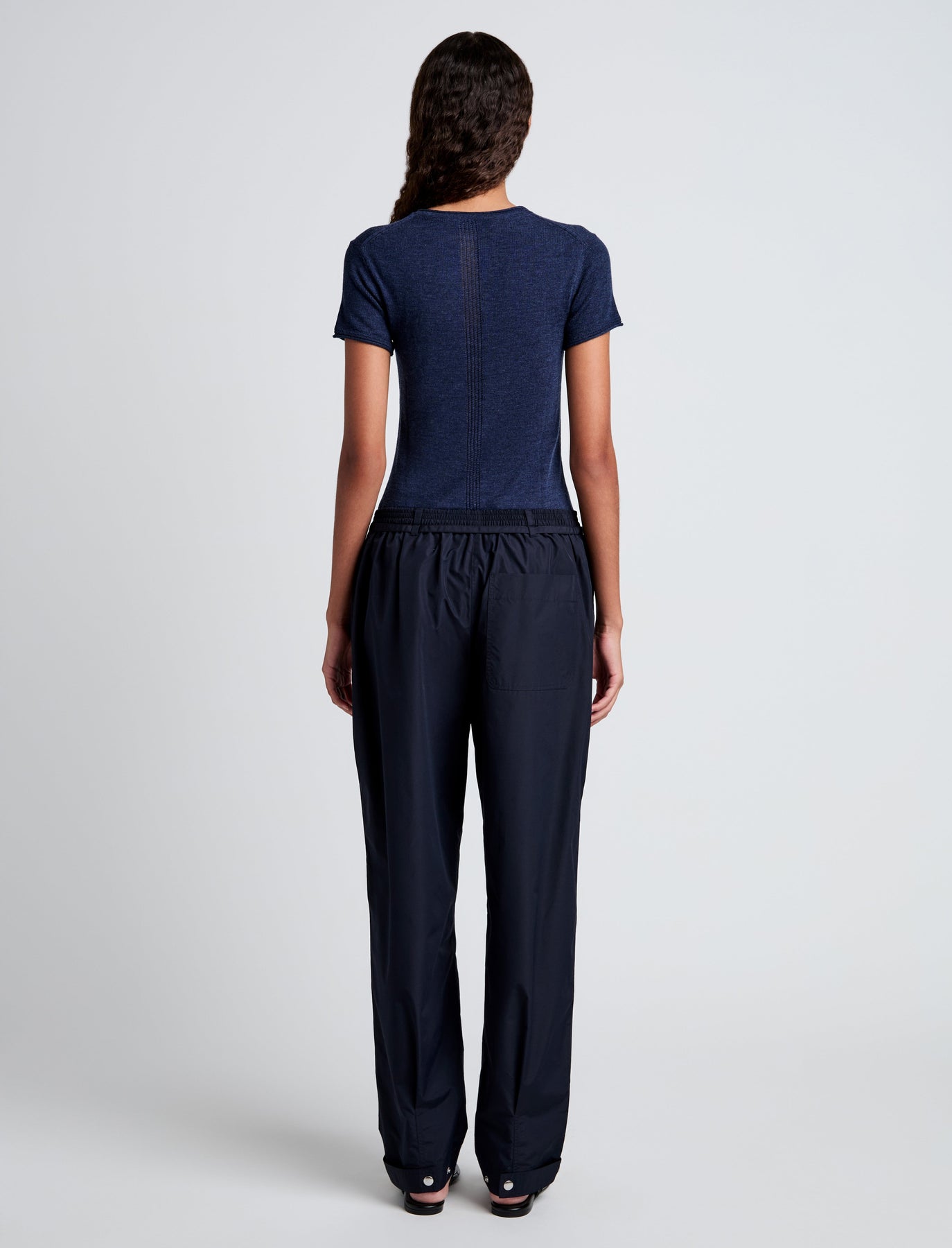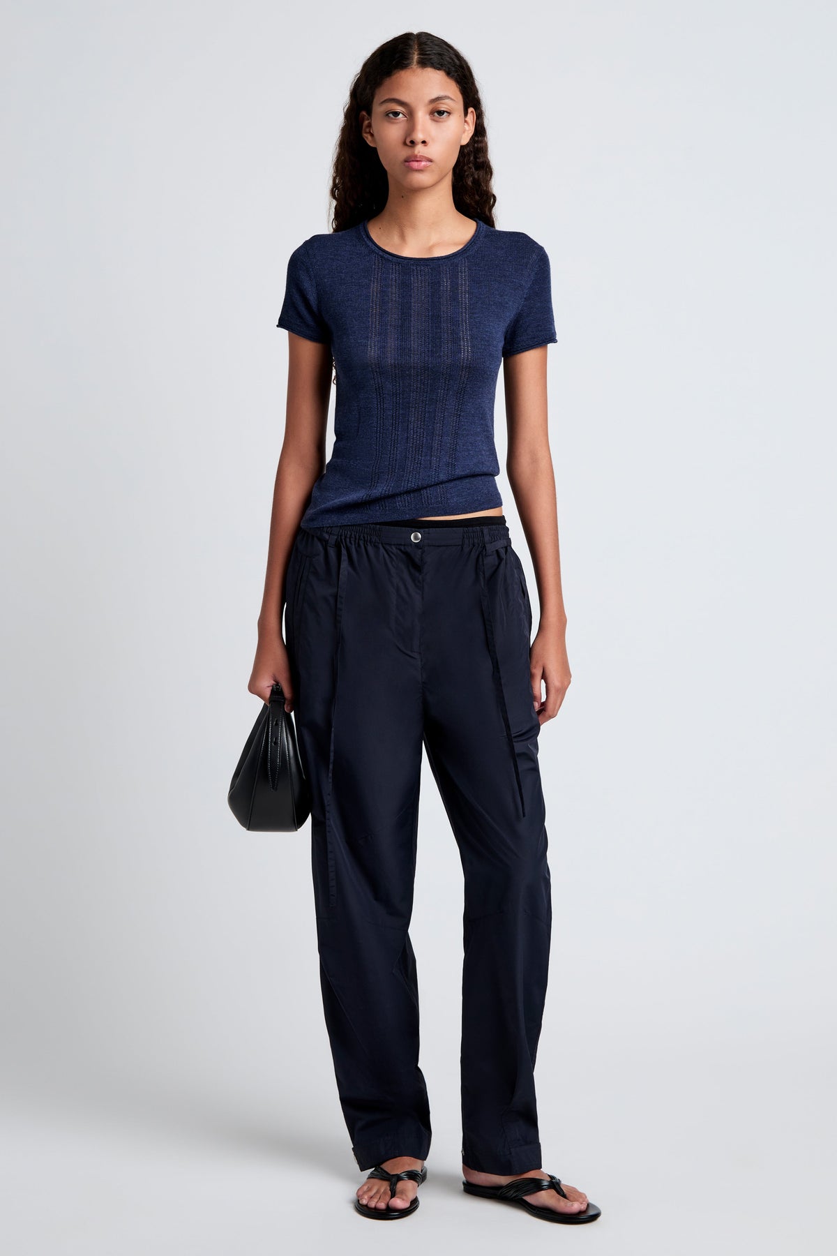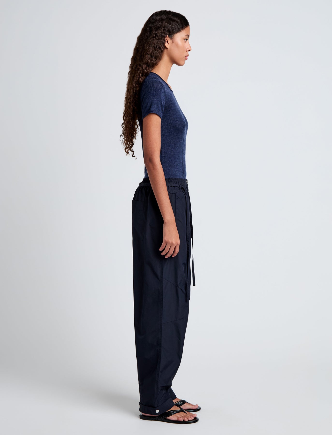The Aston Pant in Tech Cotton features a parachute-style design, tapered through the leg with button adjusters at the hem. Finished with a self-tie waist belt and side slip pockets.