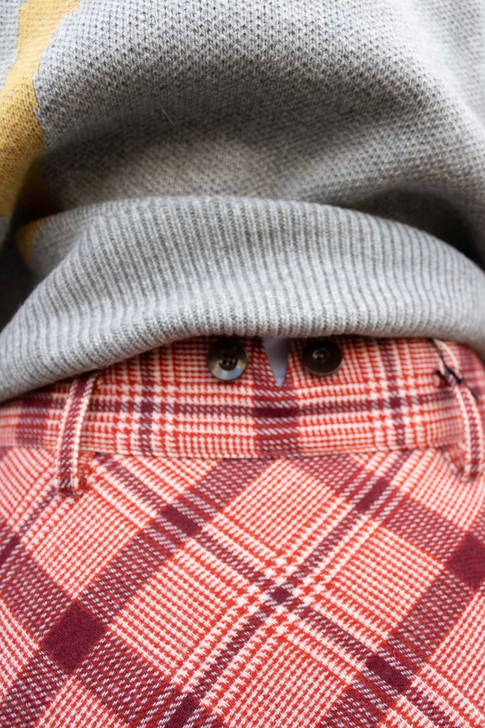 - Button tabs at waistband and side pockets