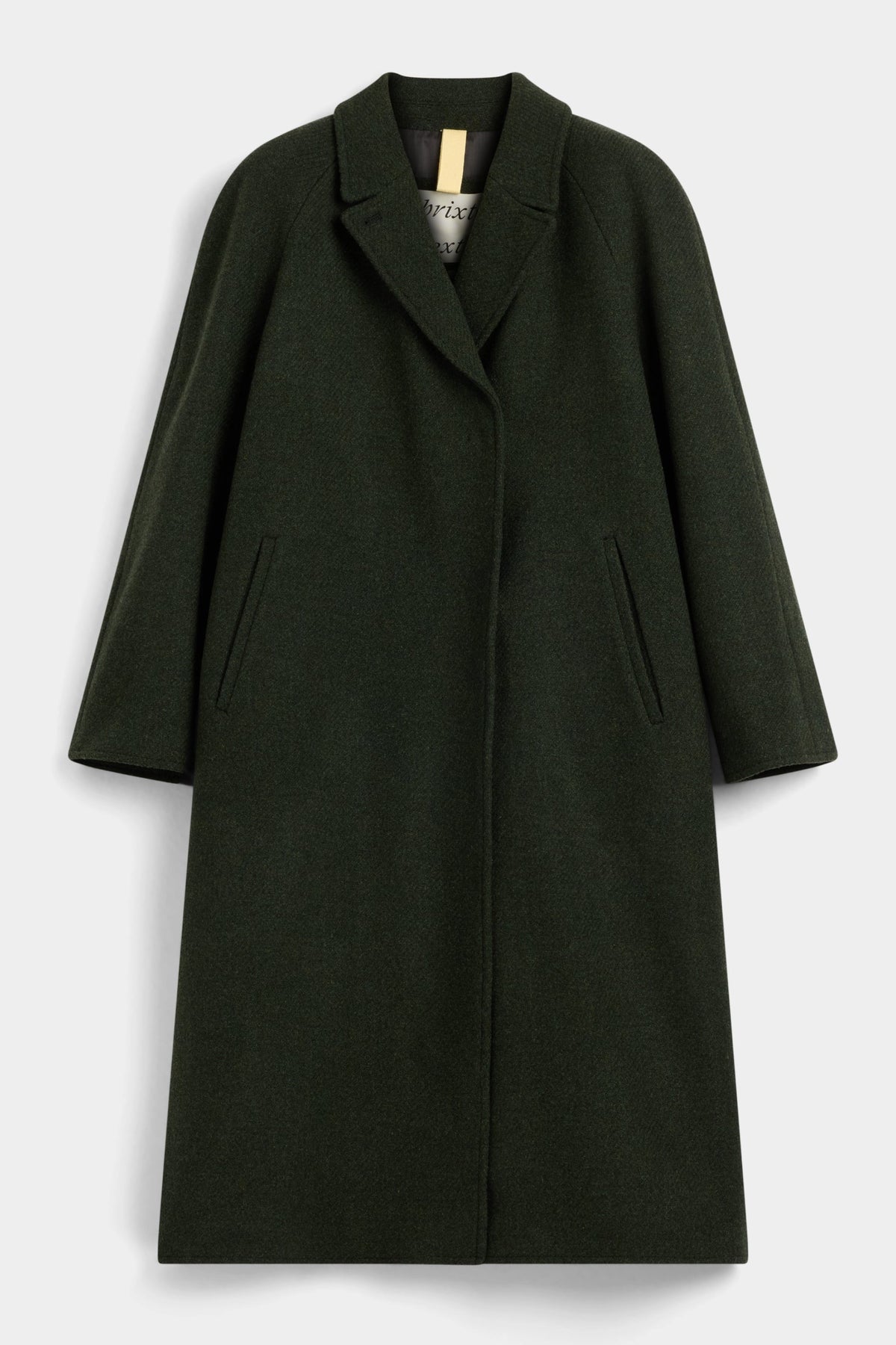 The Deb by Brixtol Textiles is a fully lined coat cut at mid-calf with a classic inverted collar and lapel at front. The coat features raglan sleeves, a relaxed straight silhouette and concealed snap button closure at front.