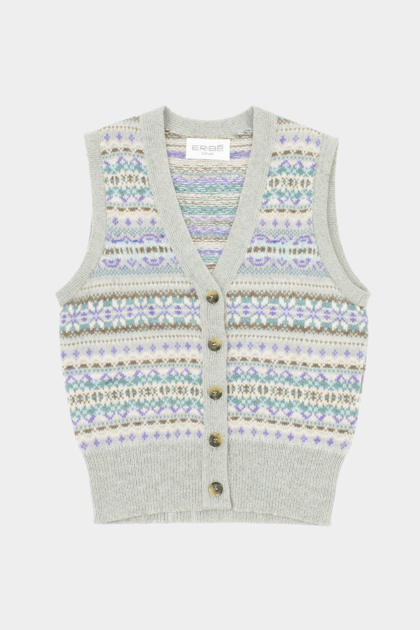 A regular fit, V-neck waistcoat that gives a flattering effect due to the long rib hem that hugs the hips. It feels like soft cashmere and is thicker than the Corry and Alpine range. The Fairisle is on the front and back.