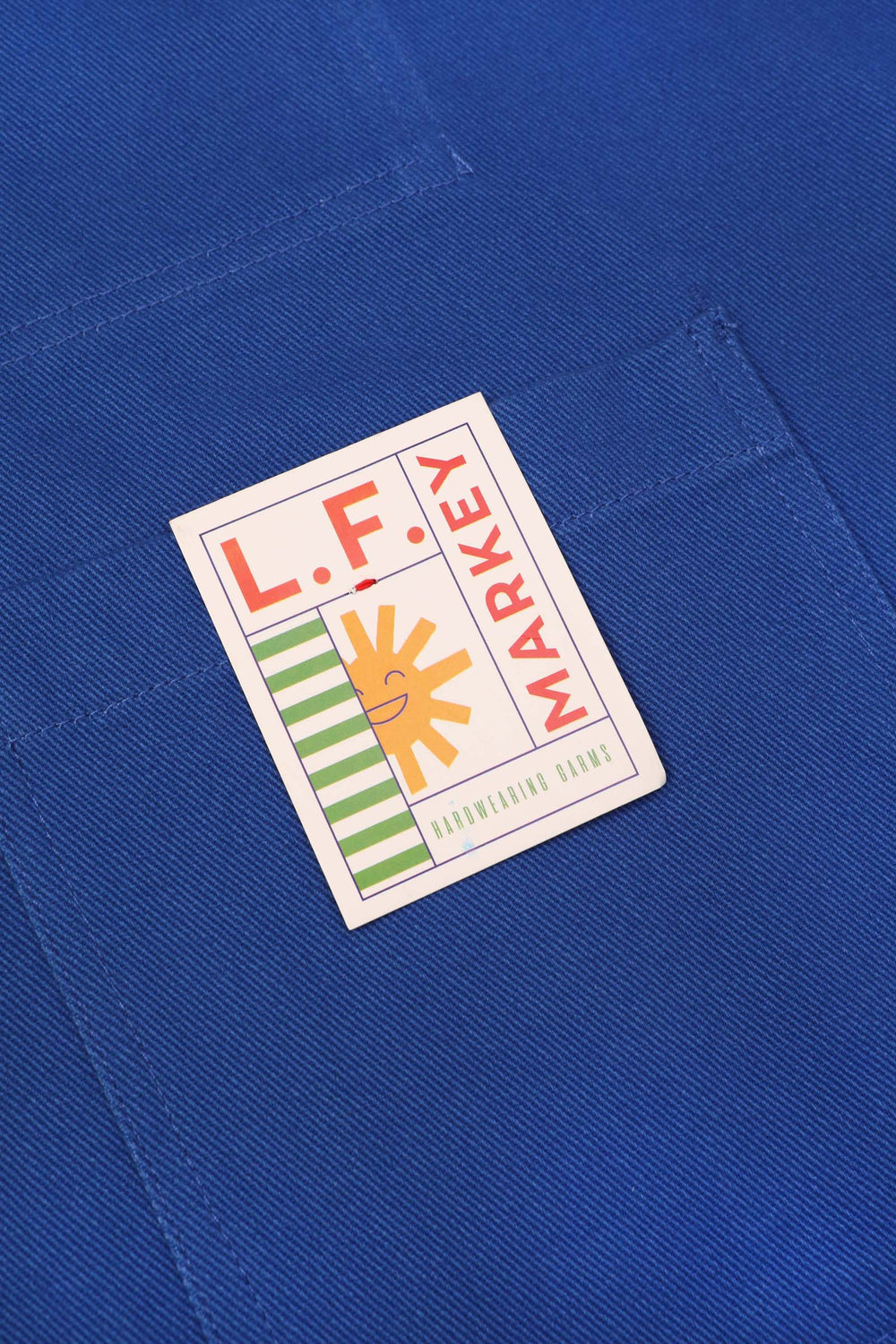 LF Markey's take on a classic chore coat with a wide boxy shape, voluminous sleeves and imitation horn buttons down the front. With side seam pockets, front patch pockets and a large removable cardboard label on the left pocket. In vibrant cobalt cotton drill with our signature sun and wave woven patch logos dotted throughout.