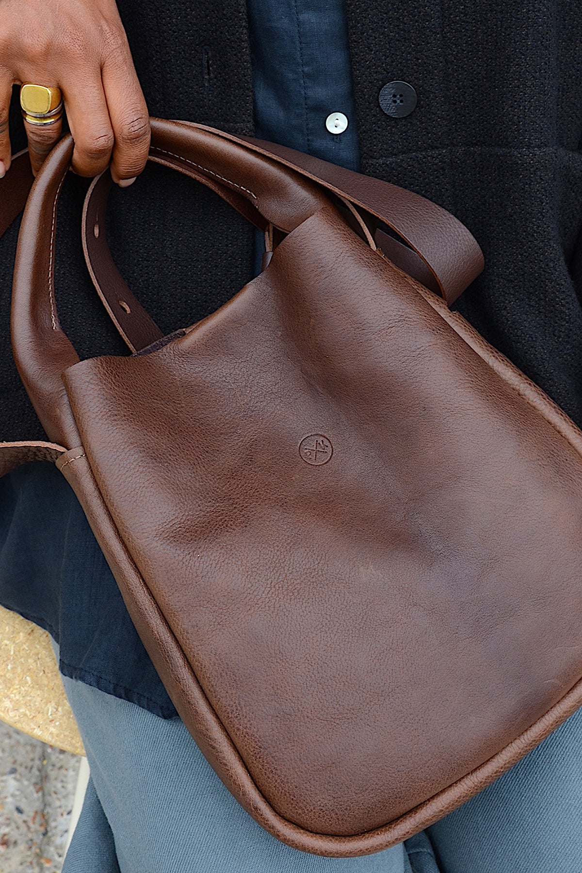 - Textured natural vegetable-tanned leather, cut by hand and machine stitched
