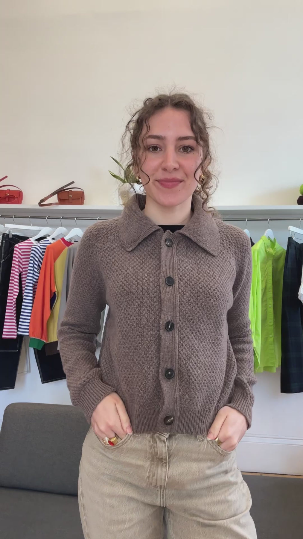 Designed by Frontiers founder, Jane Forbes, and knitted in Scotland, the Seed cardigan is a textured 100% lambswool cardigan with a knitted rib collar and down band, and a fully fashioned raglan sleeve.